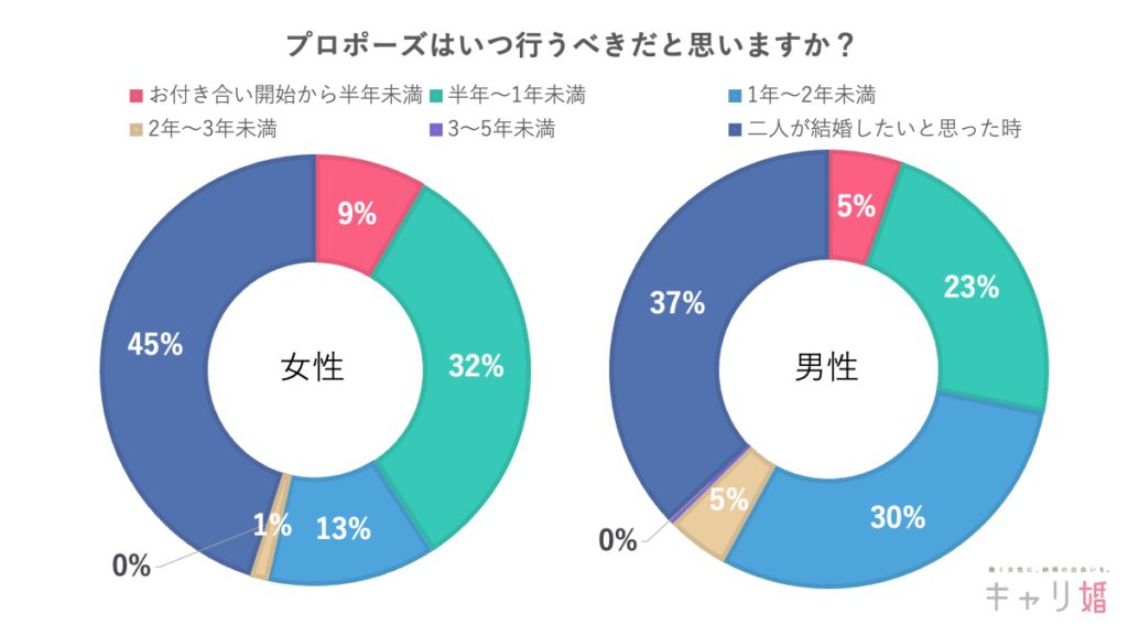 実際に「プロポーズはいつ行うべきだと思いますか?」という問いに対して、女性が「交際後、半年〜1年」を多く望むのに対して、男性は1〜2年が最も多いという結果が出ています。(「キャリ婚」プロポーズにおける意識調査/2020年)